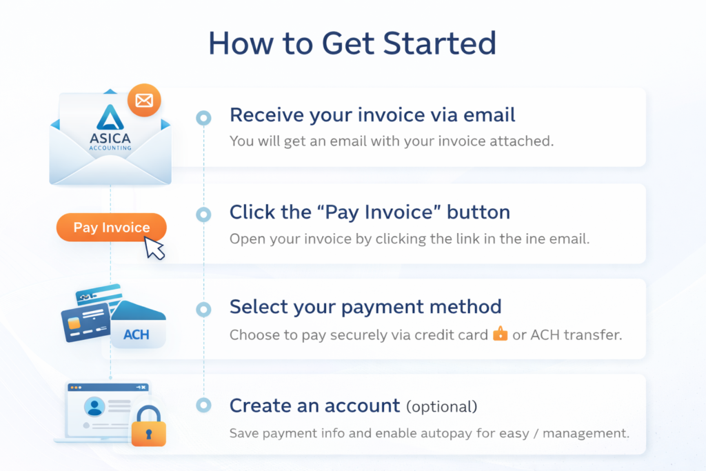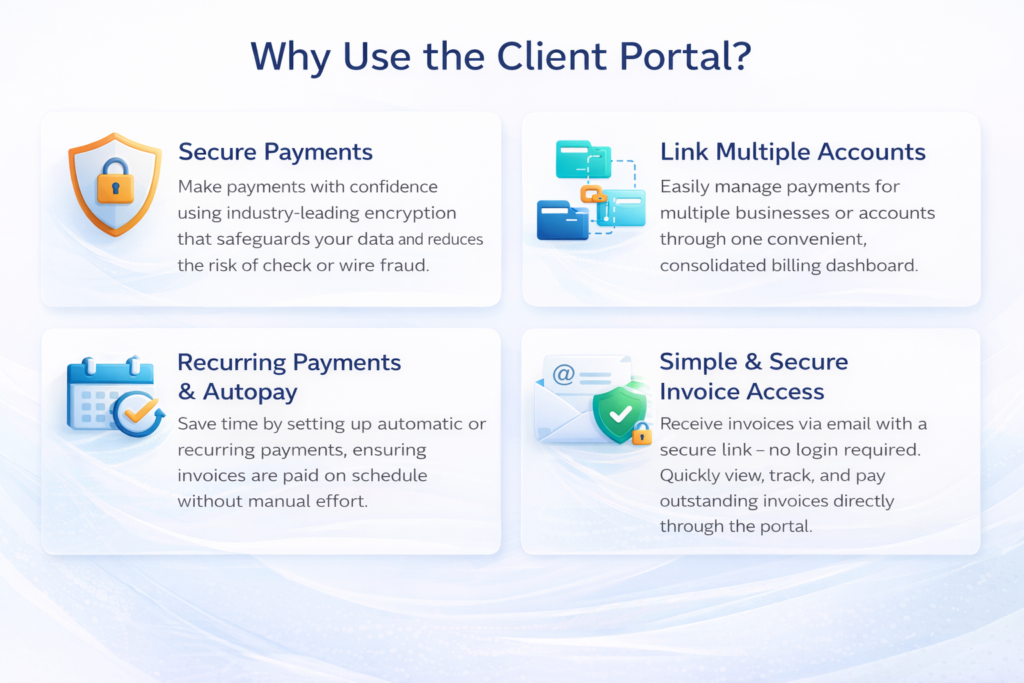 Setting up automatic payments or recurring billing is simple. Click the secure link in your invoice email and create an account.
